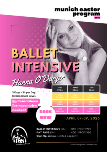 Drei Tage hintereinander in der Zeit von 07. – 09. April unterrichtet unsere Hanna O’Dwyer täglich 3h Training inklusive FloorBarre, Stange, Mitte, Technik und Repertroire. Sei dabei für dieses intensive Balletterlebnis: